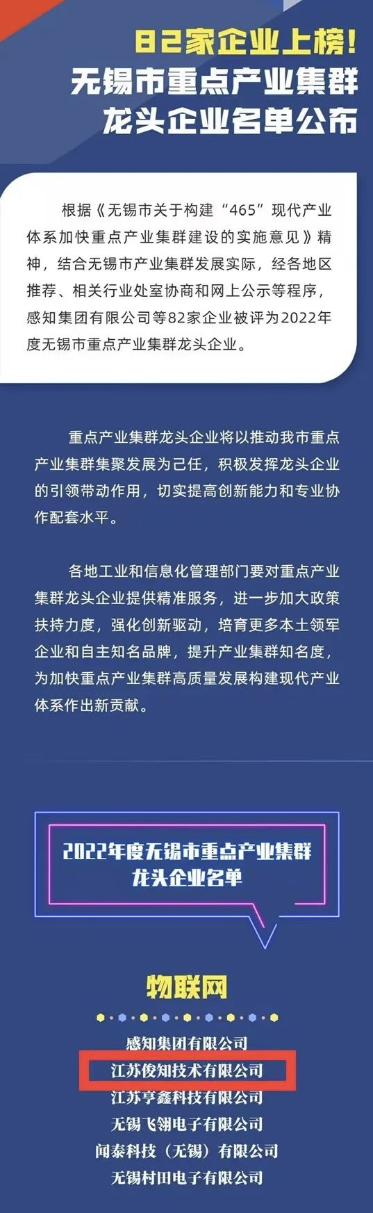 俊知技术喜获2022年度无锡市重点产业集群(物联网)龙头企业